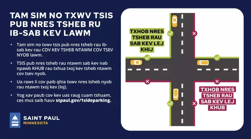 - Thov nco ntsoov ib sij xyuas one-side parking map at www.stpaul.gov/1sideparking vim yeej ib sij ntsuas cov kev thiab cov kev txwv txiav nres tsheb yuav muaj hloov.